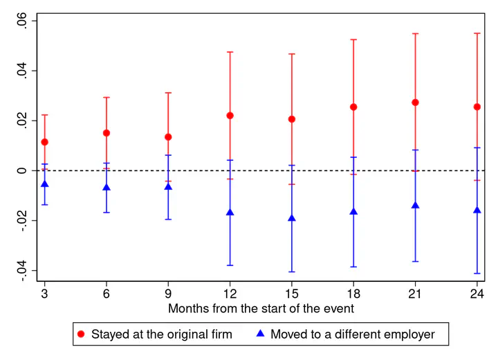 This paper studies the impact of the short-time work (STW) replacement rate on workers’ job-to-job mobility. Exploiting a discontinuity in the Italian STW schedule and matched employer–employee data, we show that a 10-percentage-point increase in the replacement rate raises the probability of remaining with the current employer by 3%, reducing job-to-job flows. The effect is driven by low-ability workers, whose transitions to higher-paying firms decline, implying a deterioration in workforce quality in STW firms. We develop a model to rationalise these results and derive an optimal STW formula. The fiscal externality is positive but smaller than for unemployment benefits.